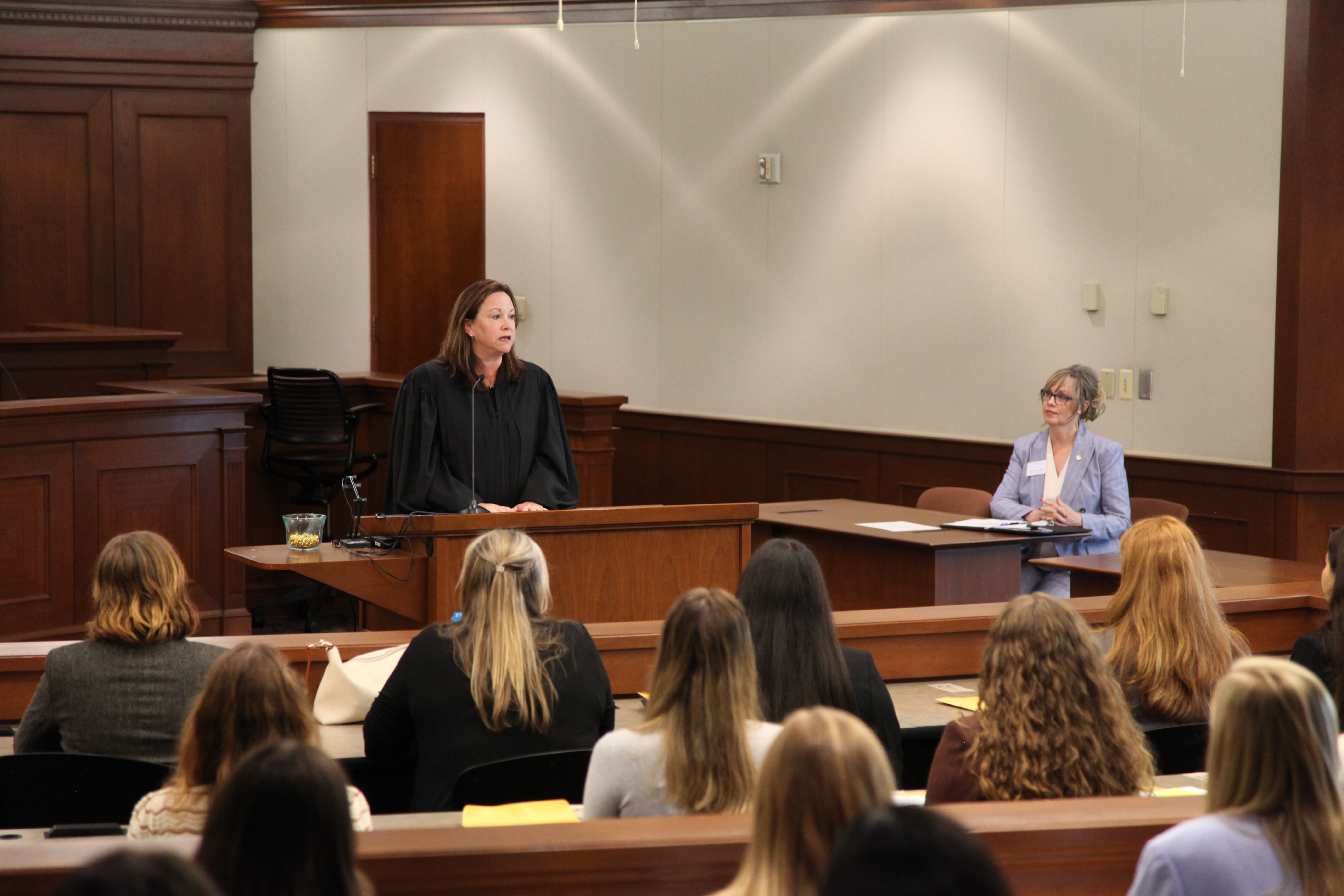 Michigan Supreme Court Chief Justice Megan K. Cavanagh, speaks with Cooley Law School students at its Lansing, Mich. campus orientation convocation, marking the “official” start of their law school career. During the convocation, Judge Cavanagh administered the professionalism oath where students commit to follow the Honor Code, the official guide to student conduct and behavior while in law school.